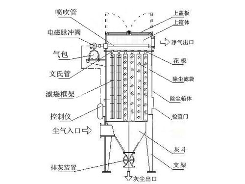 6、除塵器在進風(fēng)口的部位設(shè)置一塊擋板,防止了含塵氣體直接沖擊布袋,增加了布袋的使用壽命。
